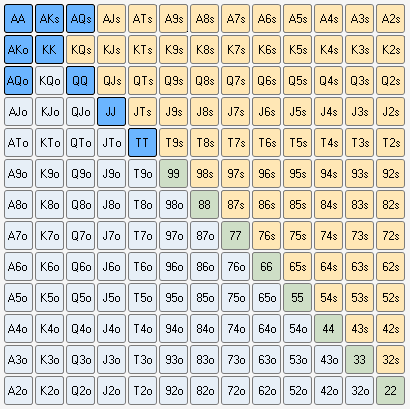 Aqui você estaria indo apenas com 5% do range. É muito restrito, é verdade, mas é uma boa base para dar o seu range call. A questão aqui é você ter sabedoria e maldade de alargar ou estreitar o seu range em certas ocasiões e circunstâncias de jogo, adicionando alguns ases suiteds, conectores e pares, por exemplo.